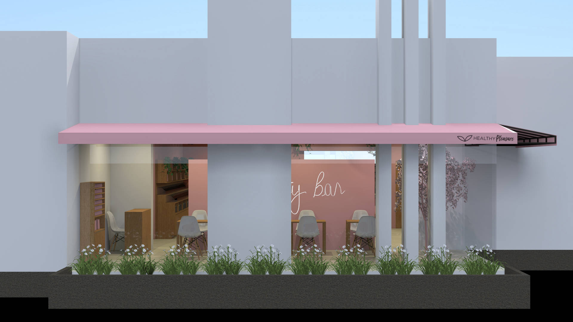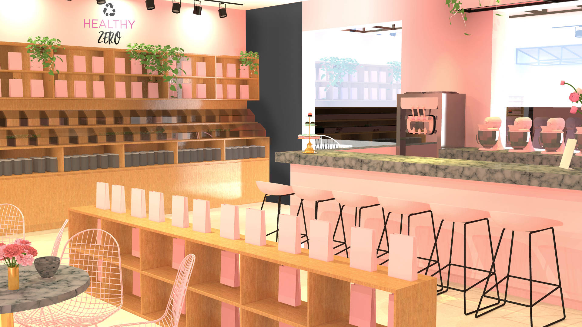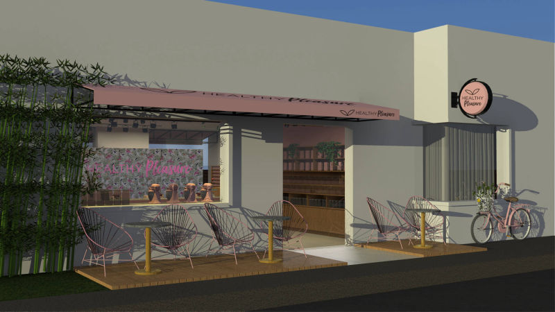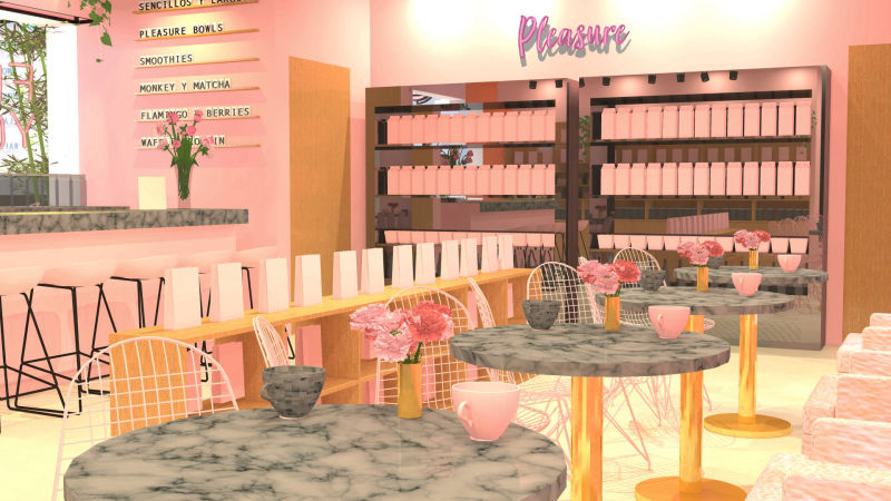 Para este proyecto se buscaba un espacio diseñado, único y diferente en el cual el cliente pudiera vender su propia marca de productos saludables y a su vez ofrecer alimentos nutritivos, usando como referencia e inspiración las cafeterías inglesas y norteamericanas donde se enfocan principalmente en la experiencia del cliente, es así como se logró este diseño inigualable donde predomina el color rosa.