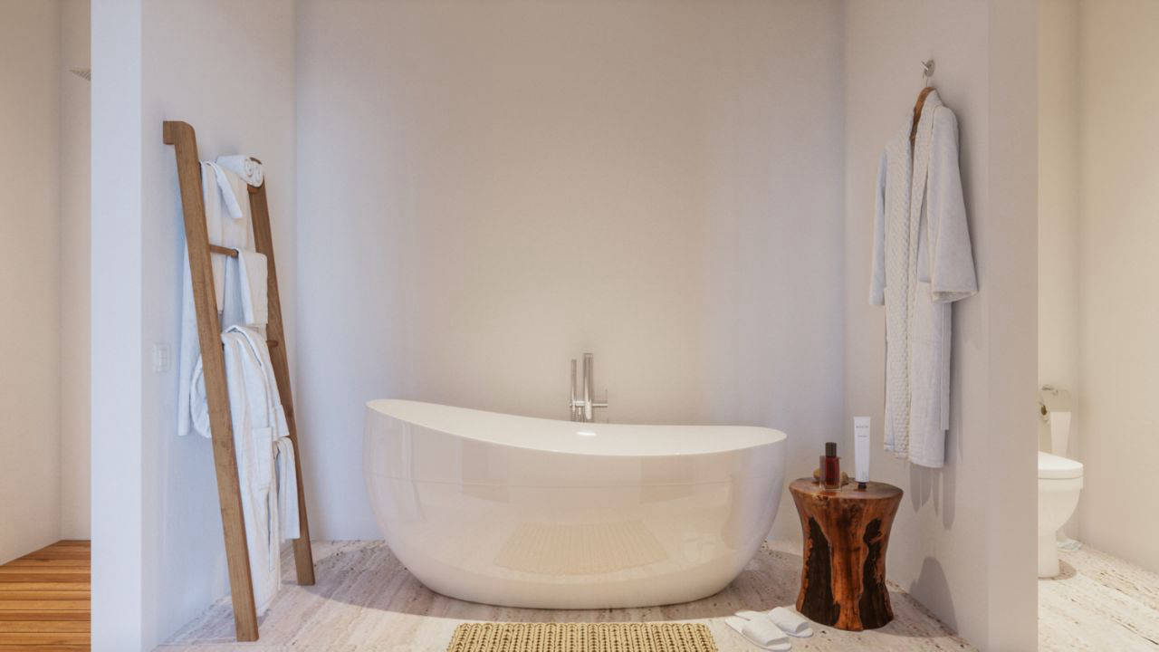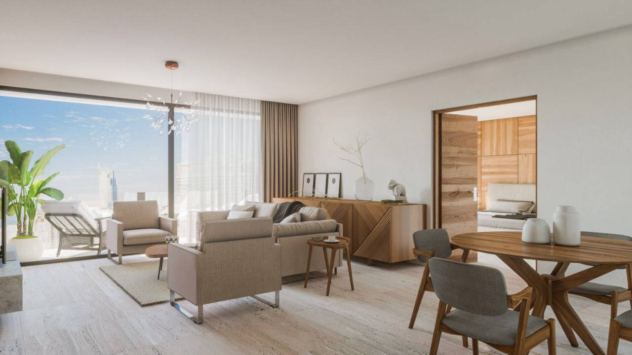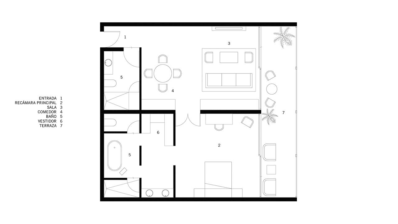 El proyecto requería de una habitación, sala donde se pudiera comer y baño completo con tina desarrollado en dos módulos de 5 x 9m con terraza de 2 x 10m. Presentación conceptual, paleta de colores, materiales, mobiliario, ambientación, plantas arquitectónicas y renders.